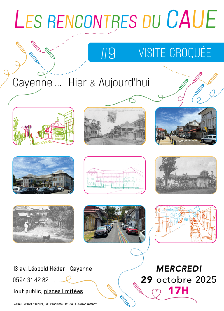 Dans le cadre de ses missions de sensibilisation auprès du grand public, le Conseil d’Architecture, d’Urbanisme et de l’Environnement de Guyane (CAUE) a proposé la neuvième rencontre du CAUE : une visite dessinée conviviale et créative du centre-ville de Cayenne !